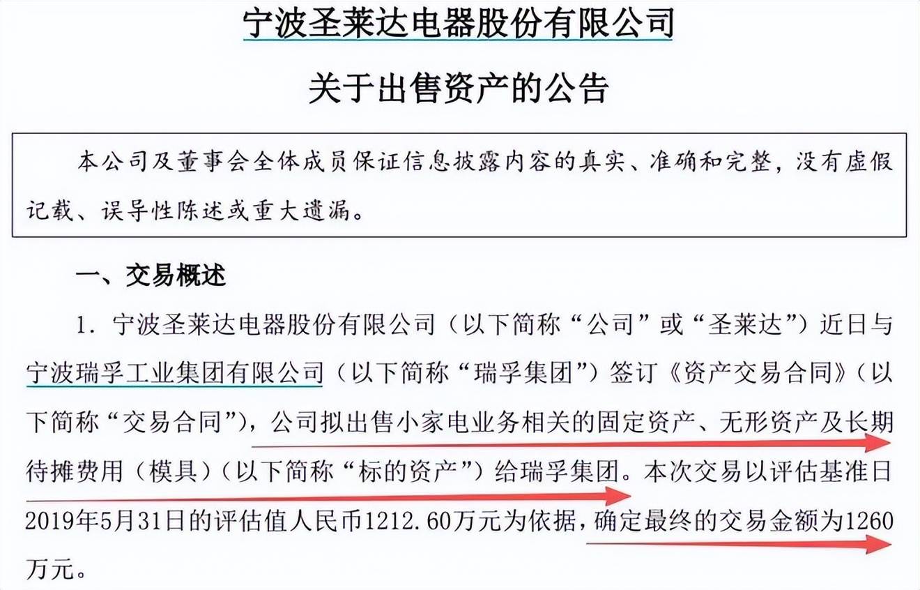 2019年7月,圣莱达(002473.SZ)公布通告称,近年来,因为产能过剩及劳动力本钱逐年升高等源由,公司小家电营业一口气损失且呈夸大化趋向,为省略规划性损失,告竣策略转型,公司拟将小家电营业以1260万元的代价出售给瑞孚工业集团。